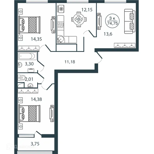 3 комн. квартира в Твери в ипотеку от 75 020 руб/месяц